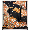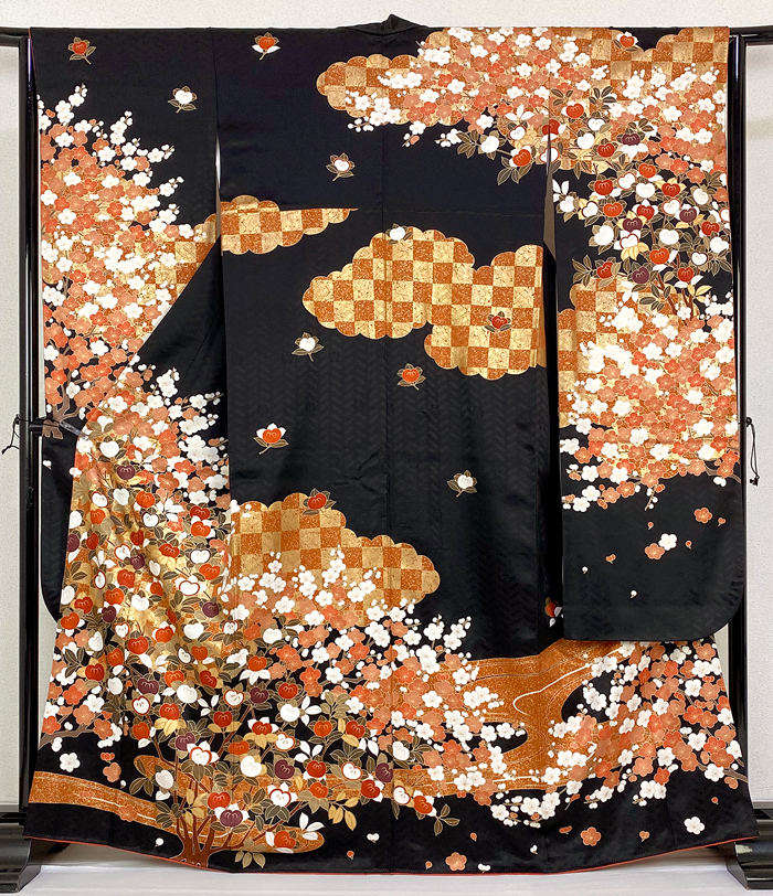 スベリの良い手触りで光沢のある桧垣と華紋の地柄を織り込んだ良質な紋意匠の生地を黒に地染めし、上前からの雲と流水に橘や梅などの花柄を丹色やオリーブグリーン・生成り・蘇芳色などの金彩糸目友禅に金駒刺繍を加え華やかに重ね染めした品。八掛けは正絹丹色暈しで胴裏は正絹が付いた手縫い仕立て。衿裏にはホック代わりに糸が付いています。ぐし縫いを施した丁寧な仕立ての品です。下前オクミに落款があります。