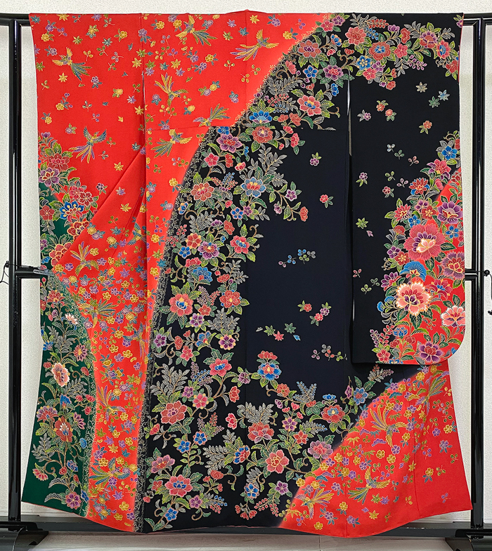 しなやかな手触りの良質な重め古代縮緬の生地を明るい丹色と黒の大きな曲線暈しに地染めし、上前からの濃いめ緑色の曲線暈しと、花鳥などの更紗文様の柄を納戸色や辛子色・ルビー色などに金彩を加え鮮やかに重ね染めした品。八掛けは正絹表色無地でオクミ裏に柄を置き胴裏は正絹が付いた手縫い仕立て。