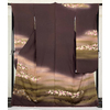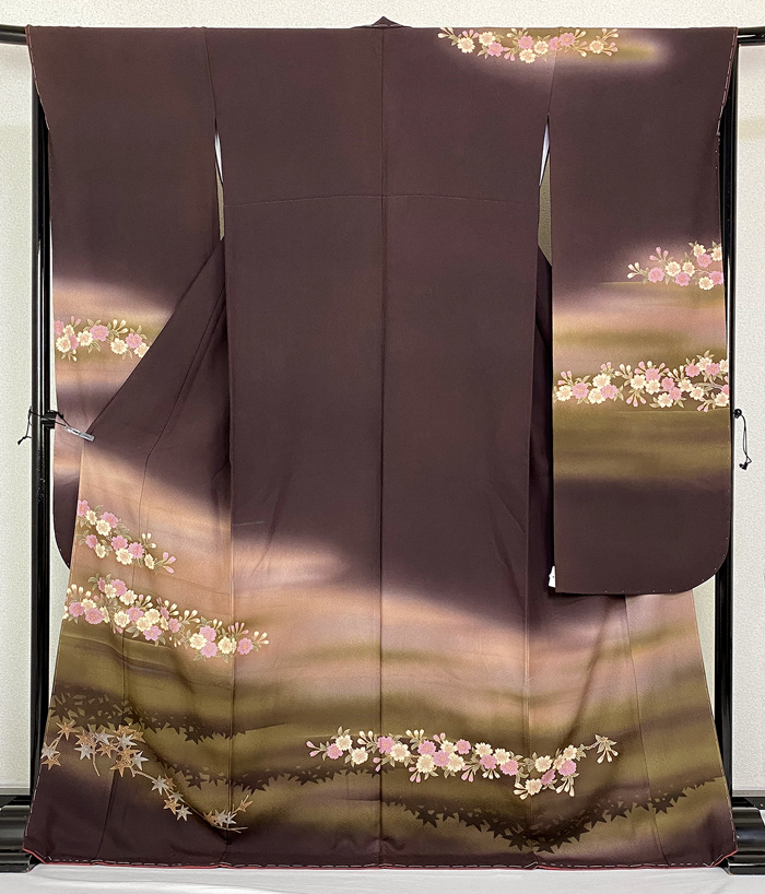 シャリ感のある触りで花サヤガタと真砂の地柄をフクレ織りで重ねた良質な紋綸子の生地をくすんだこげ茶に地染めし、上前からのオリーブグリーンや赤みの砥粉(とのこ)色の横段暈しと、桜や楓などの柄をベージュ色や薄紫・紅色などに金彩を加えお洒落に重ね染めした品。八掛けは正絹暗い今様色無地でオクミ裏に柄を置き胴裏は正絹が付いた手縫い仕立て。衿裏にはくるみホックが付いています。