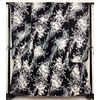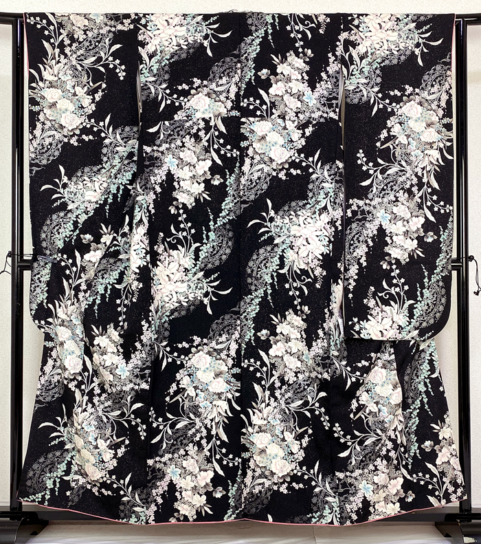 シャリ感のある手触りで銀通しを重ねた重め紋意匠の生地を黒に地染めし、洋風の枝花柄を生成りや水色・薄紫・エメラルドグリーンなどに銀彩を加え重ね染めした品。八掛けは正絹紅梅色暈しで胴裏は正絹が付いた手縫い仕立て。衿裏にはホック代わりに糸が付いています。紅梅色の正絹重ね衿が付いています。
