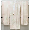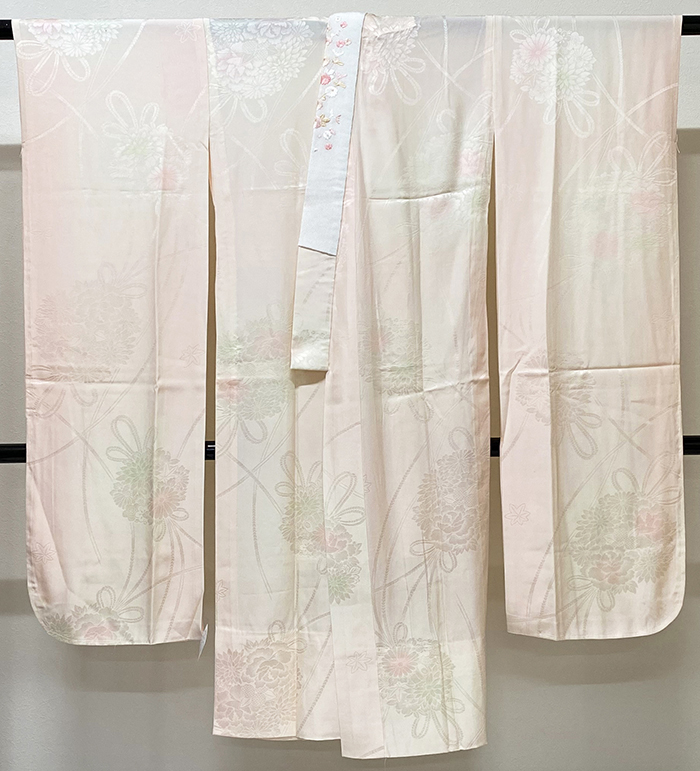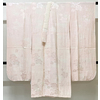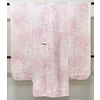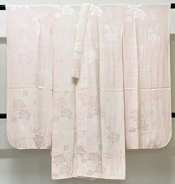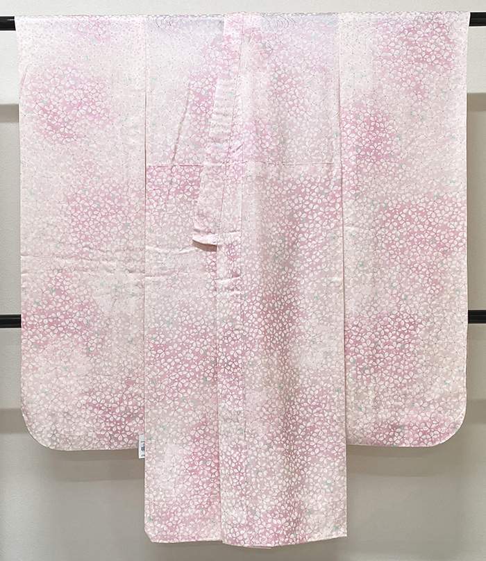 しなやかな手触りの流水花柄を織り込んだ綸子生地を優しいピンク色濃淡に地染めし、白と薄緑色で花柄を染めた品。腰から下の後幅一杯に正絹居敷当てが付いた袖無双の単衣仕立て。手縫い仕立て。