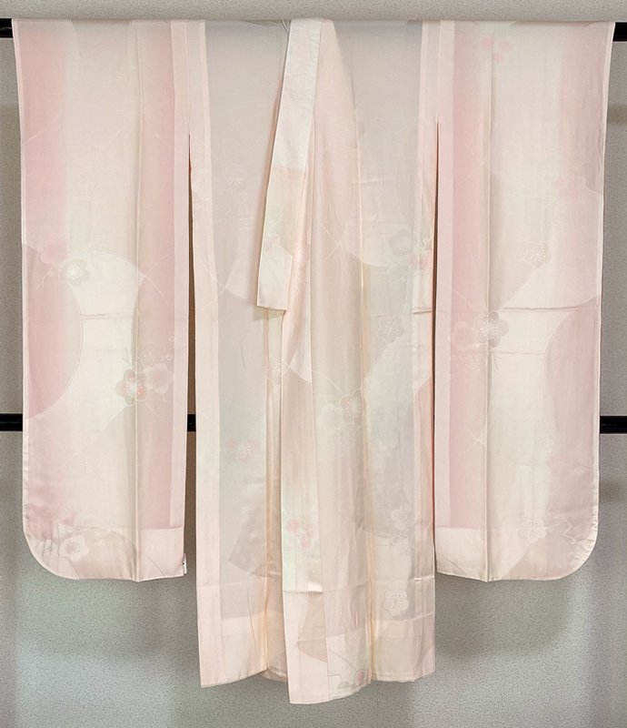 スベリの良い手触りで光沢のある曲線取り枝梅の地柄を織り込んだ紋綸子の生地を朱鷺(とき)色に地染めし、少しの紅梅色暈しを地紋起こしで丁寧に重ね染めした品。腰から下の背縫い沿いに共生地の居敷当てが付き、袖裏に赤みの紅梅色暈しが付いた袖無双の単衣仕立て。