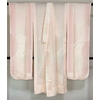 スベリの良い手触りで光沢のある小桜の地柄を織り込んだ紋綸子の生地を朱鷺(とき)色に地染めし、流水と小花の柄を生成りの縫い取り絞りで柔らかく重ね染めした品。共生地の肩当てが付き、背伏せは別生地が付いた、袖無双の単衣仕立て、正絹白半衿が付いています。