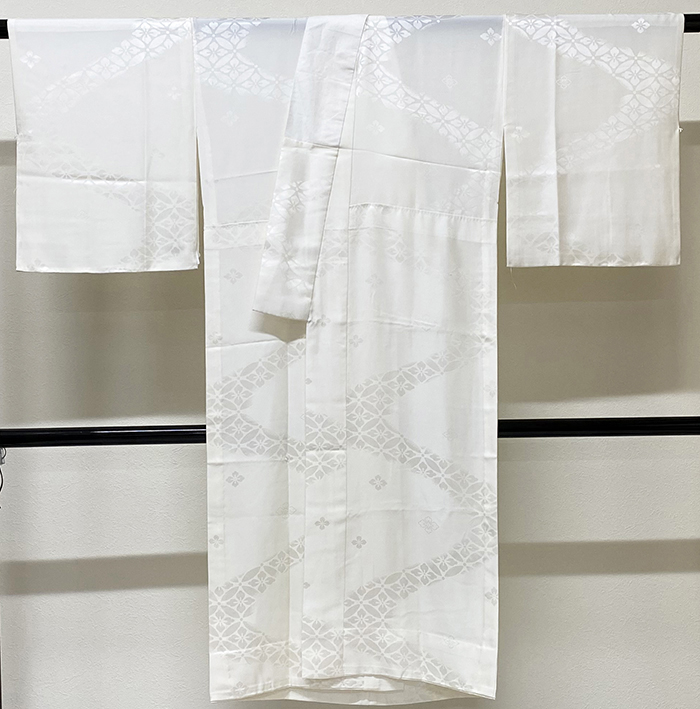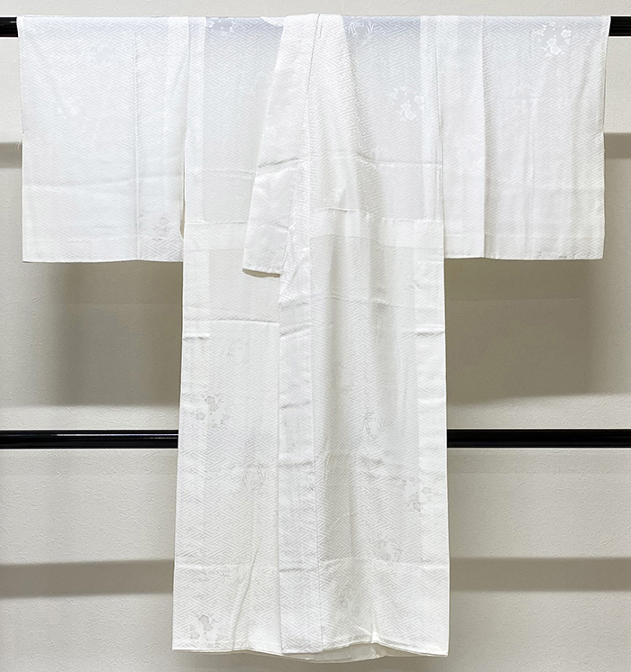 しなやかな手触りの小花とサヤガタの地柄を織り込んだ紋綸子の白襦袢。腰から下の後幅一杯に正絹居敷当てが付いた袖無双の単衣仕立て。手縫い仕立て。