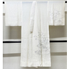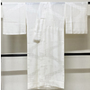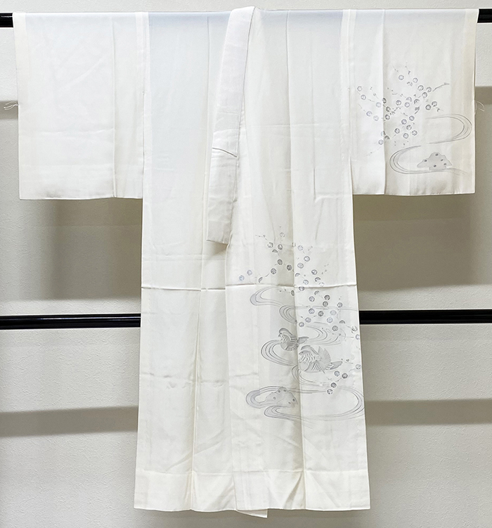 しなやかな手触りの正絹パレス織り生地で、絵羽取り流水オシドリと花などの柄を墨色に少しの銀彩を加え染めた白襦袢。腰から下の後幅一杯に正絹居敷当てが付いた袖無双の単衣仕立て、ポリエステル白半衿が付いています。手縫い仕立て。