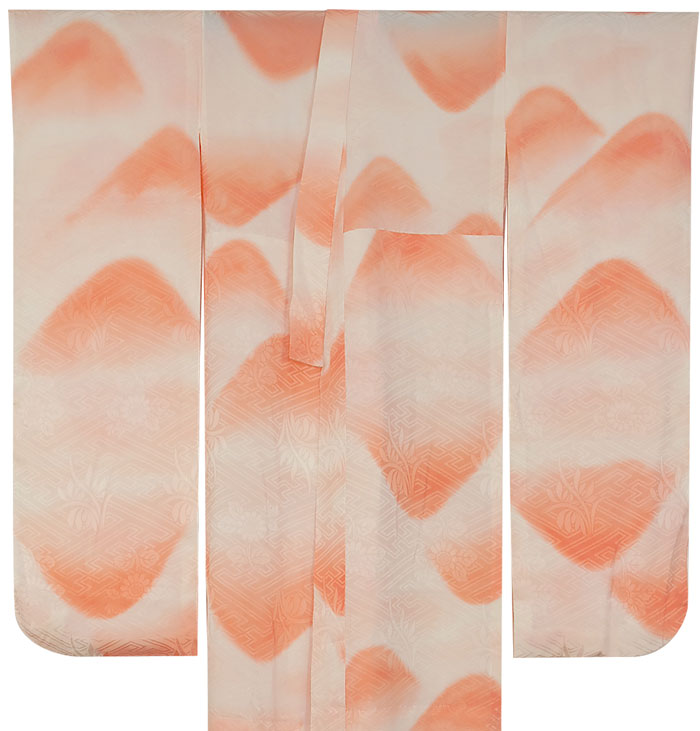 スベリの良い手触りで光沢のある大きな花サヤガタの地柄を織り込んだ紋綸子の生地を朱鷺(とき)色に地染めし、遠山重ねの柄を曙色濃淡暈しで重ね染めした品。背伏せは共生地返しが付いた袖無双の単衣仕立てです。