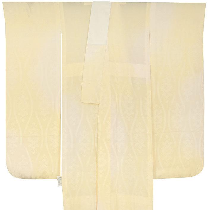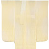 スベリの良い手触りで光沢のある立涌に蔓花の地柄を織り込んだ紋綸子の生地を薄い黄色濃淡に生成りを加えた暈しで染め上げた品。腰から下の後幅一杯に正絹居敷当てが付いた袖無双の単衣仕立て。衿は広衿仕立てです。