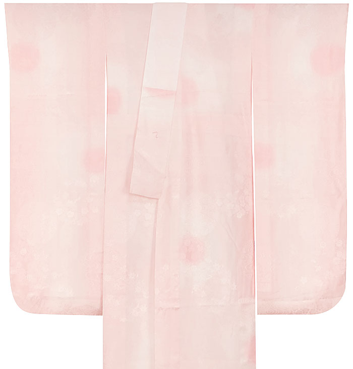 スベリの良い手触りで光沢のある薬玉の地柄を織り込んだ紋綸子の生地を朱鷺(とき)色濃淡暈しで染め上げた品。正絹通し裏が付き袖裏に紅梅色暈しが付いた袖無双の袷仕立て。衿は広衿仕立てです。