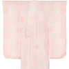 スベリの良い手触りで光沢のある露芝に花の地柄を織り込んだポリエステル重め紋綸子の生地を朱鷺(とき)色濃淡暈しに地染めし、地柄を薄藤・紅梅色で重ね染めした品。ポリエステル白の通し裏が付いた袖無双の袷仕立て。朱鷺(とき)色のポリエステル刺繍半衿が付いています。手縫い仕立て。