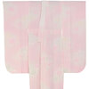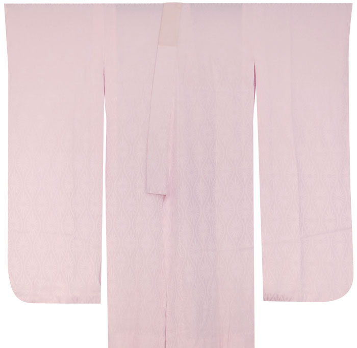 スベリの良い手触りで光沢のある立涌華紋の地柄を織り込んだ良質な紋綸子の生地を薄い退紅色無地で染め上げた品。袖無双の単衣仕立て。