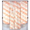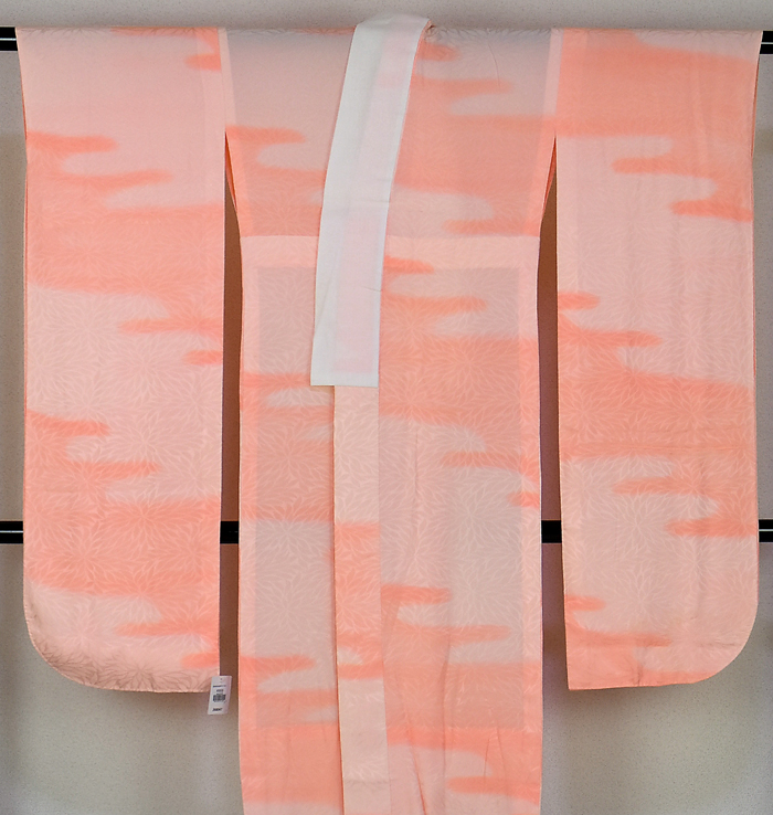 スベリの良い手触りで光沢のあるムジナ菊の地柄を織り込んだ紋綸子の生地を曙色濃淡の霞暈しで染め上げた品。背伏せは共生地返しで、袖無双の単衣仕立て。通し衿仕立てで、三河芯が広衿状に付いています。