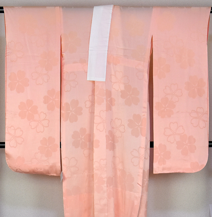 スベリの良い手触りで光沢のある花の地柄を織り込んだ重め紋綸子の生地を朱鷺(とき)色無地で染め上げた品。背伏せは共生地返しで、袖無双の単衣仕立て。通し衿仕立てで、三河芯が広衿状に付いています。