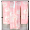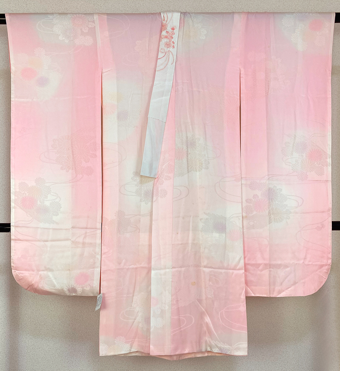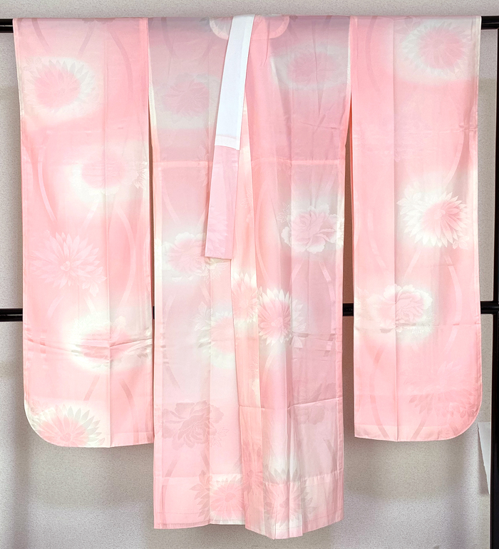 スベリの良い手触りで光沢のある花筏の地柄を織り込んだ紋綸子の生地を朱鷺(とき)色濃淡暈しに地染めし、少しの藤色やクリーム色暈しを地紋起こしで重ね染めした品。お尻部分に正絹別生地の居敷当てが付き、袖裏に紅梅色暈しが付いた袖無双の単衣仕立て。正絹白の刺繍半衿が付いています。