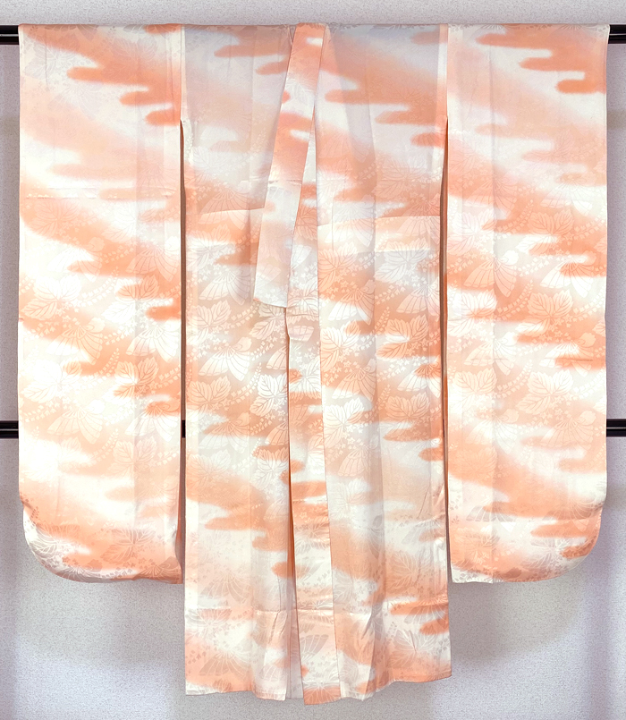スベリの良い手触りで光沢のある蝶と桐花などの地柄を織り込んだ紋綸子の生地を曙色に地染めし、斜め取り流水暈しを生成りで重ね染めした品。背伏せは共生地返しで、袖無双の単衣仕立て。