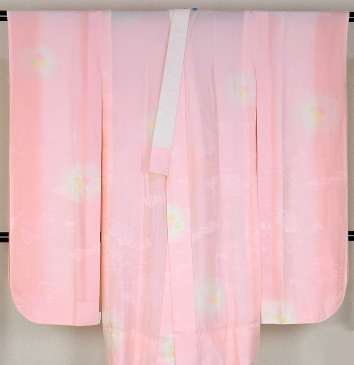 スベリの良い手触りで光沢のある御所車に花の地柄を織り込んだ紋綸子の生地を紫みのピンクや薄い黄色・曙色などの縦暈しでやわらかく染め上げた品。腰から下の後幅一杯に正絹居敷当てが付いた袖無双の単衣仕立て。