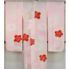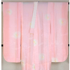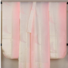 スベリの良い手触りで光沢のある枝花の地柄を織り込んだ絹ポリエステル交織の紋綸子の生地を朱鷺(とき)色に地染めし、白濃淡暈しと少しの紅梅色暈しを加え重ね染めした品。ポリエステル肩当てが付いた袖無双の単衣仕立て。