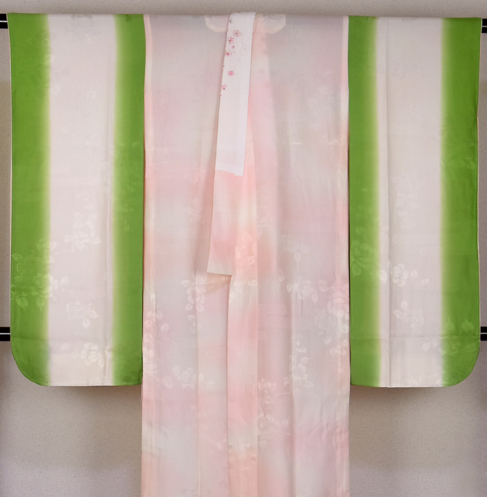 スベリの良い手触りで光沢のある霞に枝花の地柄を織り込んだ紋綸子の生地を生成りと朱鷺(とき)色暈しに地染めし、両内外袖の両脇に濃いめ黄緑暈しを加え重ね染めした品。背縫い沿いに共生地の居敷当てが付いた袖無双の単衣仕立て。ポリエステル白の刺繍半衿が付いています。