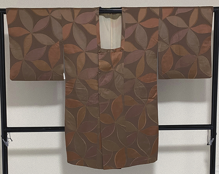 張りのある手触りで大きな花と真砂の地柄をフクレ織りで織り込んだ紋意匠の生地を明るいこげ茶色に地染めし、花柄を海老茶やくすんだ赤紫などで重ね染めした品。裏地は正絹が付き、ベージュ色に青ネズや紅梅色の暈しで染めた品です。ミシン併用ハイテク仕立て。