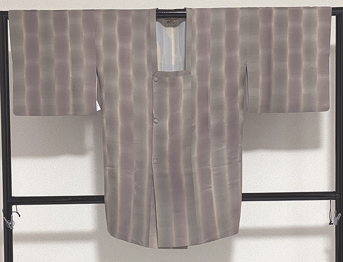 しなやかな手触りの横縞の地柄を織り込んだ紋意匠の生地を白茶に地染めし、暗い藤ネズ色に薄緑色などの縦縞暈しで重ね染めした品。裏地は正絹が付き、淡い珊瑚色に抽象柄を薄緑色や青紫色などで染めた品です。