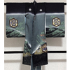 しなやかな手触りでサヤガタの地柄を織り込んだ紋綸子の生地を黒に地染めし、兜や軍配に扇と雲などの柄を金彩に、紫やエンジ色・金茶などを加え重ね染めし、胴部分はくすんだ青緑色で、裾に青磁色と金の吹雪を染めた品。八掛けは正絹表色暈しが付き、ポリエステル胴裏が付いています。薄い水色の袖重ねが付いた、亀甲と鶴の地柄を織り込んだポリエステル白長襦袢が付いています。