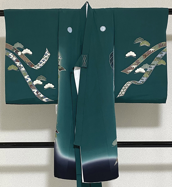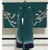 しなやかで良い手触りの変わり一越の生地を緑色と裏葉色暈しの染め分けに地染めし、裾の黒暈しと、鷲と宝尽くしと弓矢などの柄を青色や赤紫・金彩などで重ね染めした品。八掛けは正絹黒無地が付き、ポリエステル胴裏が付いています。薄い水色の袖重ねが付いた、鶴と小菊の地柄を織り込んだポリエステル白長襦袢が付いています。