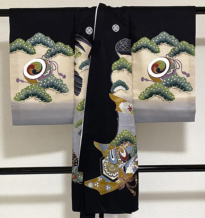しなやかでスベリの良い手触りのサヤガタの地柄を織り込んだ紋綸子の生地を黒に地染めし、ベージュ色と藤ネズの染め分けの上に、鷲と兜に宝尽くしなどの柄を青紫や薄緑色・エンジ色・金彩などで重ね染めした品。八掛けは正絹黒暈しが付き、ポリエステル胴裏が付いています。薄い水色の袖重ねが付いたポリエステル白長襦袢が付いています。
