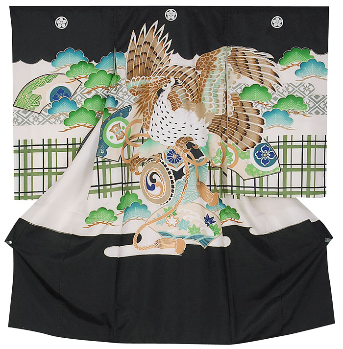 張りのある手触りで細糸で確りと打ち込まれた羽二重の生地を黒に地染めし、背中の太鼓や雲取りに鷹などの柄を白茶・金茶濃淡・青緑・金彩・金糸刺繍などで豪華に重ね染めした品。八掛けはポリエステル表色無地で、ポリエステル胴裏と白のポリエステル袖重ねが付いています。ポリエステル白長襦袢が付いています。共生地の紐が付いています。