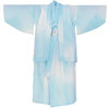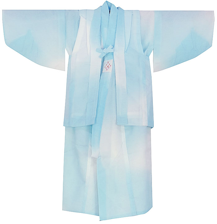 シャリ感のある手触りのポリエステル駒絽の生地を薄い緑みの青ネズ濃淡暈しで染め上げた品。木綿白の紗織りの通し裏が付いた袷仕立て。腰紐が付いています。袖は船底仕立てになっています。