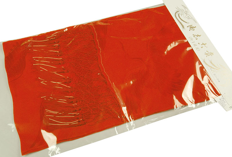 スベリの良い手触りで光沢のある鶴の地柄を織り込んだ正絹紋綸子の生地を紅色無地で染め上げたしごき。同色のレーヨン飾り房が付いています。