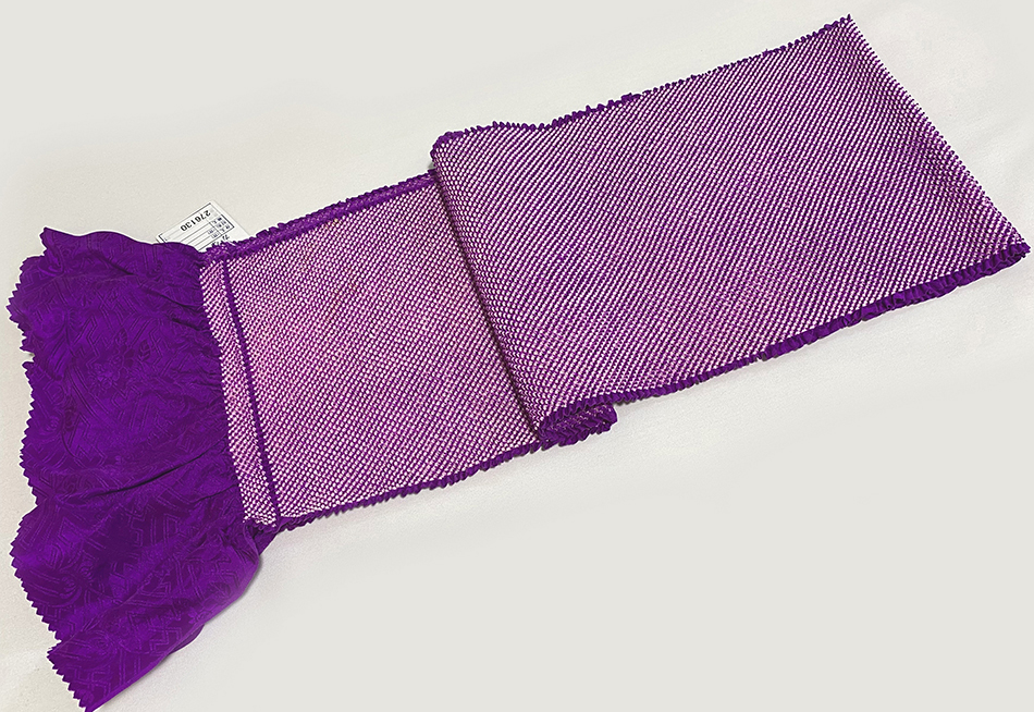 スベリの良い手触りで光沢のある花サヤガタの地柄を織り込んだ紋綸子の生地を明るい京紫に地染めし、白の総鹿の子絞りで仕上げた品。