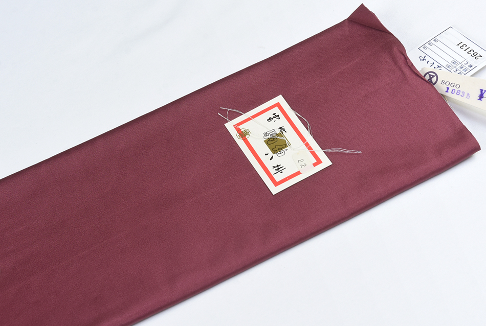 しなやかな手触りで確りと打ち込まれた精華縮緬の生地を濃いめの暗め丹色無地で染め上げた品。
