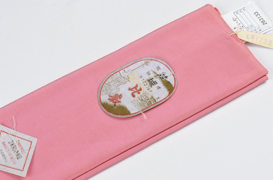 しなやかな手触りで確りと打ち込まれた精華縮緬の生地を明るいツツジ色無地で染め上げた品。