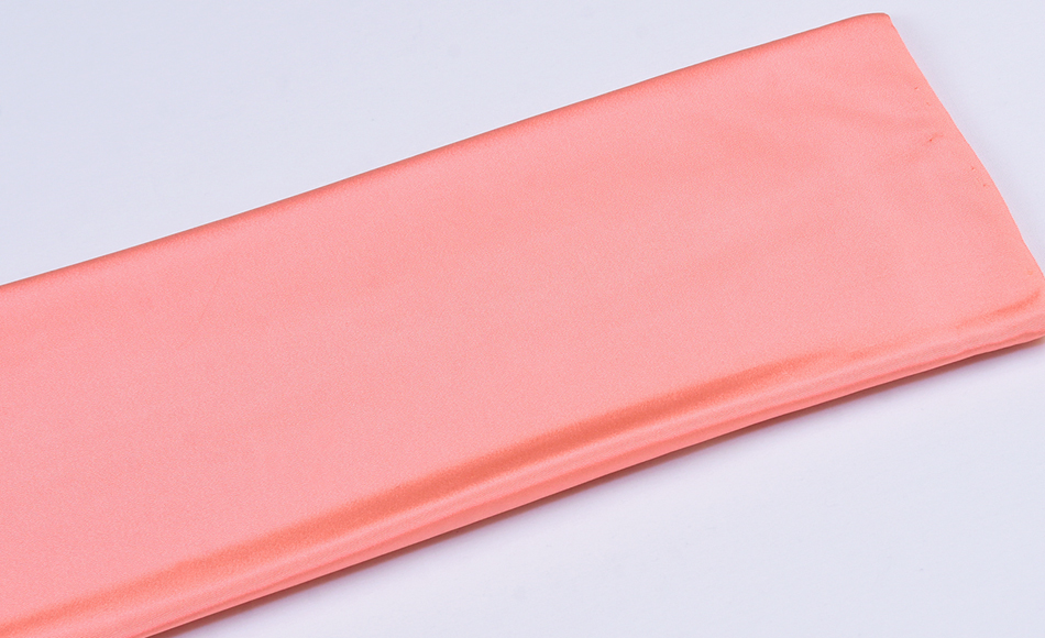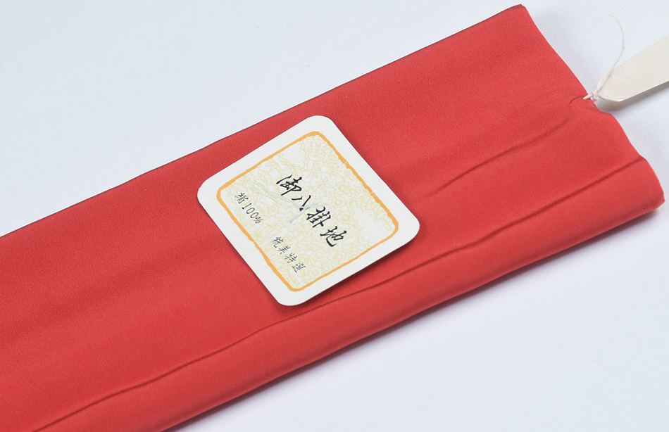しなやかな手触りで確りと打ち込まれた精華縮緬の生地を明るい丹色無地で染め上げた品。