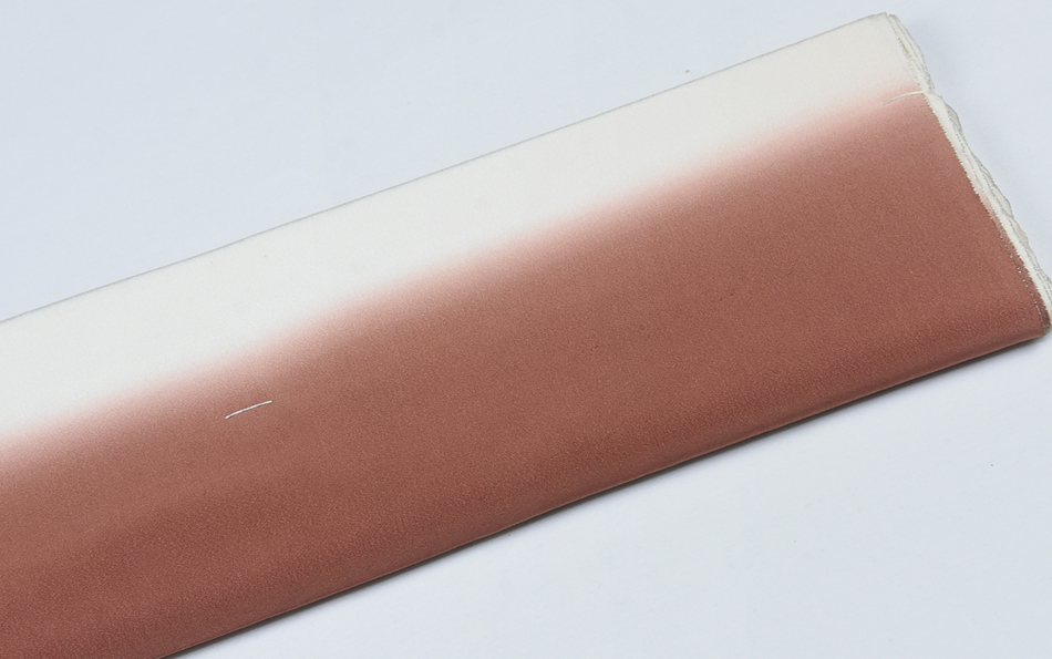 しなやかな手触りで確りと打ち込まれた精華縮緬の生地を柔らかな暗め赤茶暈しで染め上げた品。