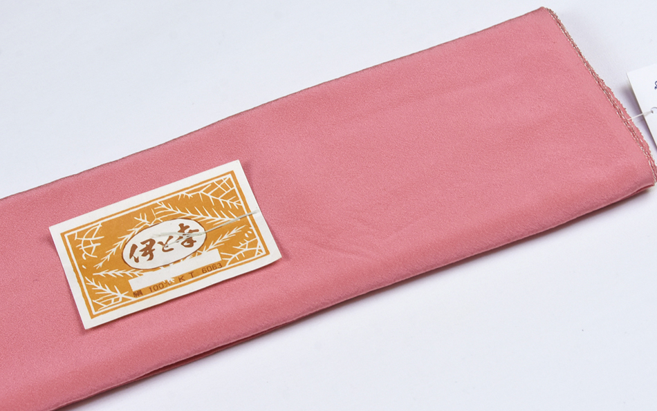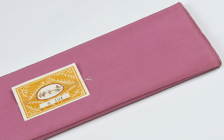 しなやかな手触りで確りと打ち込まれた精華縮緬の生地を濃いめ黄みの紅梅色無地で染め上げた品。