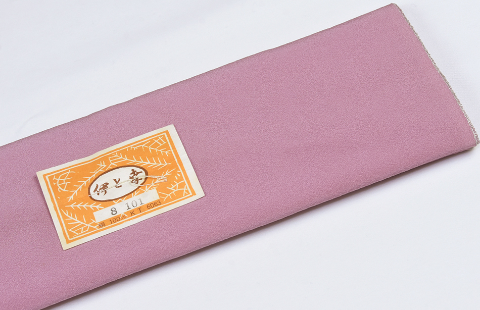 しなやかな手触りで確りと打ち込まれた精華縮緬の生地を赤みの藤色無地で染め上げた品。