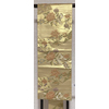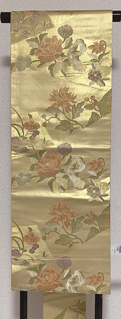 しなやかな手触りで確りと打ち込まれた金の錦の地織りに、花柄を紫色や緑色・錆朱色などで重ね織りした品。