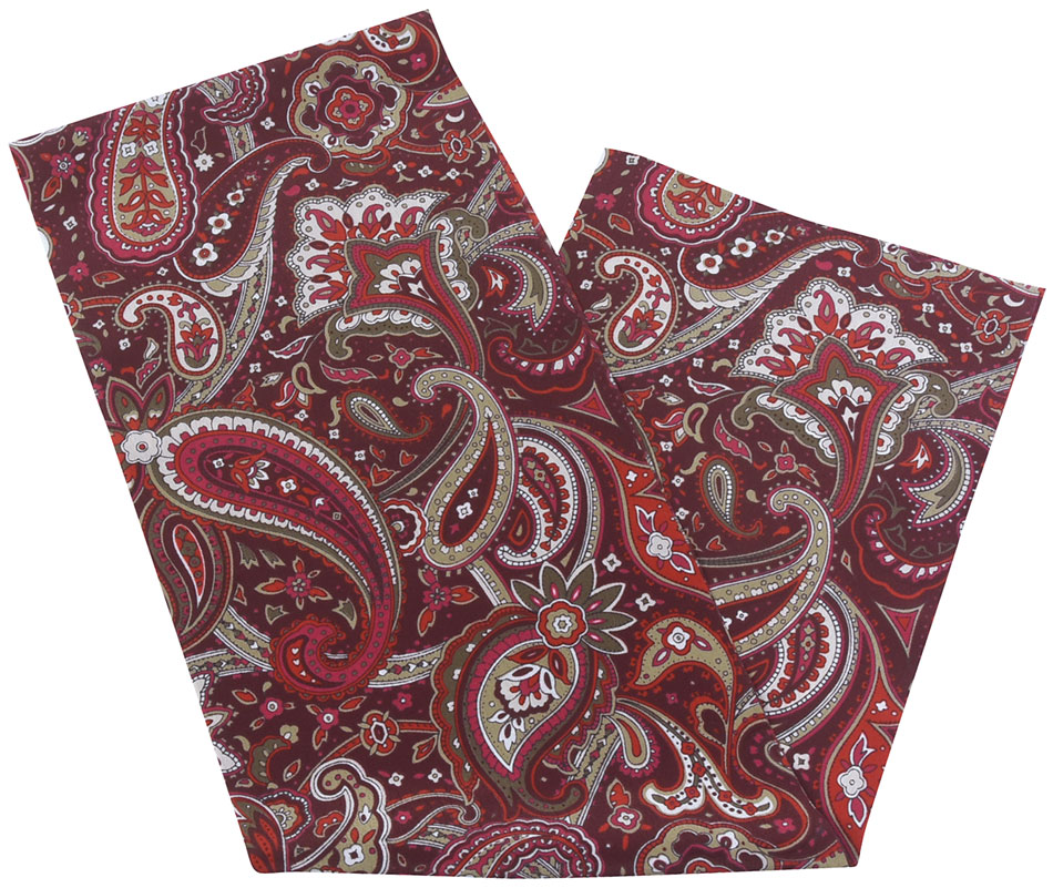 スベリの良い手触りの小豆色の薄手のポリエステル生地に、ペイズリーの柄を茜色・オリーブ色・白などで染め上げた品。