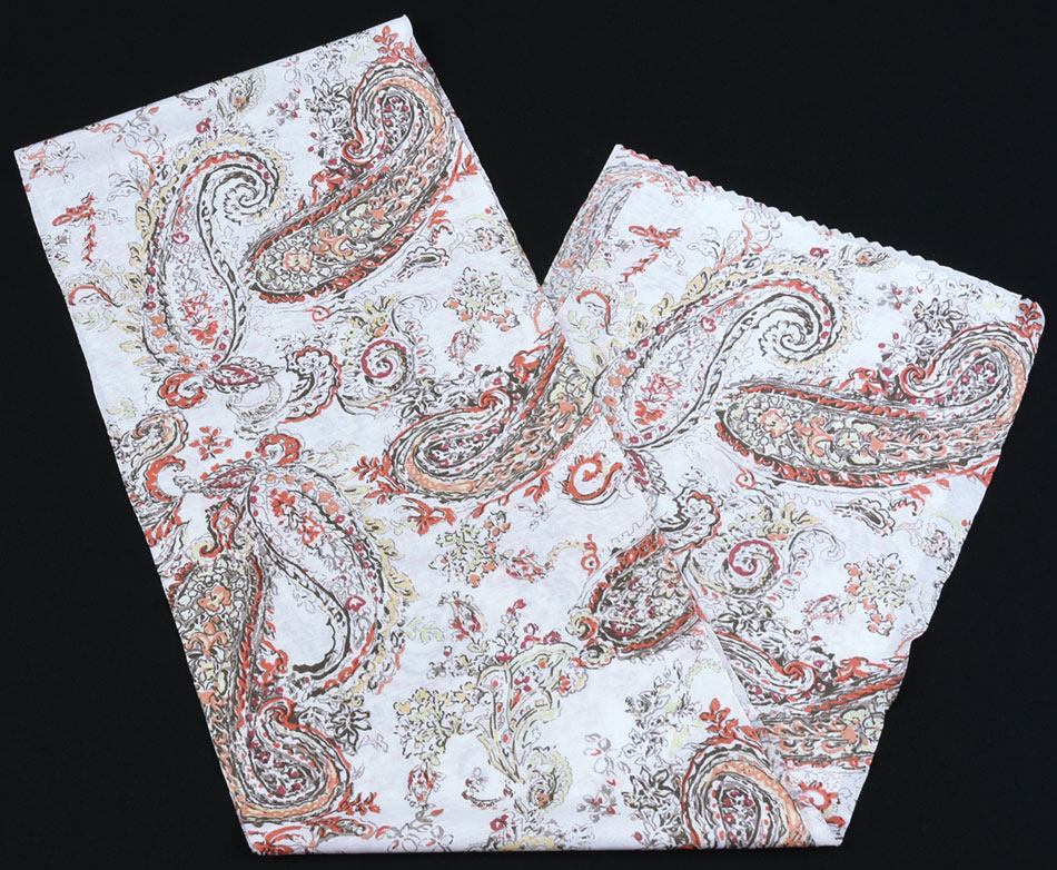 スベリの良い手触りの白の薄手のポリエステル生地に、ペイズリーの柄を朱赤・オリーブグリーンなどで染め上げた品。