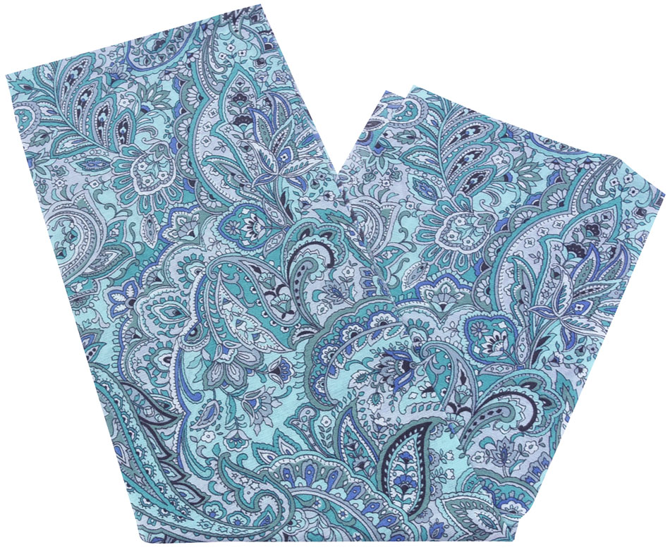 スベリの良い手触りの青磁色の薄手のポリエステル生地に、ペイズリーの柄を黒茶・オリーブグリーン・青緑などで染め上げた品。