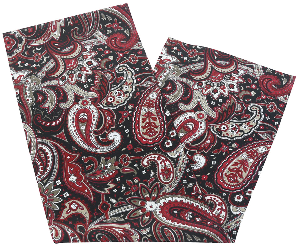 スベリの良い手触りの黒の薄手のポリエステル生地に、ペイズリーの柄を赤・砥粉(とのこ)色・白などで染め上げた品。