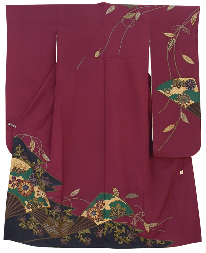 スベリの良い手触りで光沢のある曲線の地柄を織り込んだ重め紋意匠の生地を丹色とこげ茶の染め分け暈しに地染めし、上前からの扇面重ねに花蝶の柄を茜色や木賊(とくさ)色・ミント色などに金彩を加え重ね染めした品。八掛けは正絹くれない色無地で胴裏は正絹が付いた手縫い仕立て。