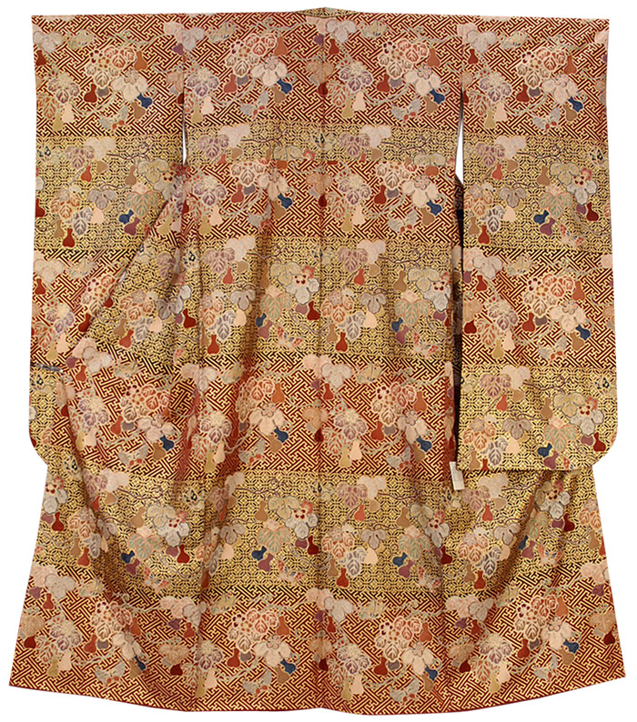 スベリの良い手触りで光沢のあるサヤガタの地柄を織り込んだ紋緞子の生地を小豆色に地染めし、横段取り七宝繋ぎやサヤガタなどの柄の金彩友禅の上に、蔓花に蝶などの柄を今様色や納戸色、藤ネズに利休ネズを加え豪華に重ね染めした品。八掛けは正絹小豆色無地にオクミ裏から裾に掛けて丁寧に柄を置き胴裏は正絹が付いた手縫い仕立て。