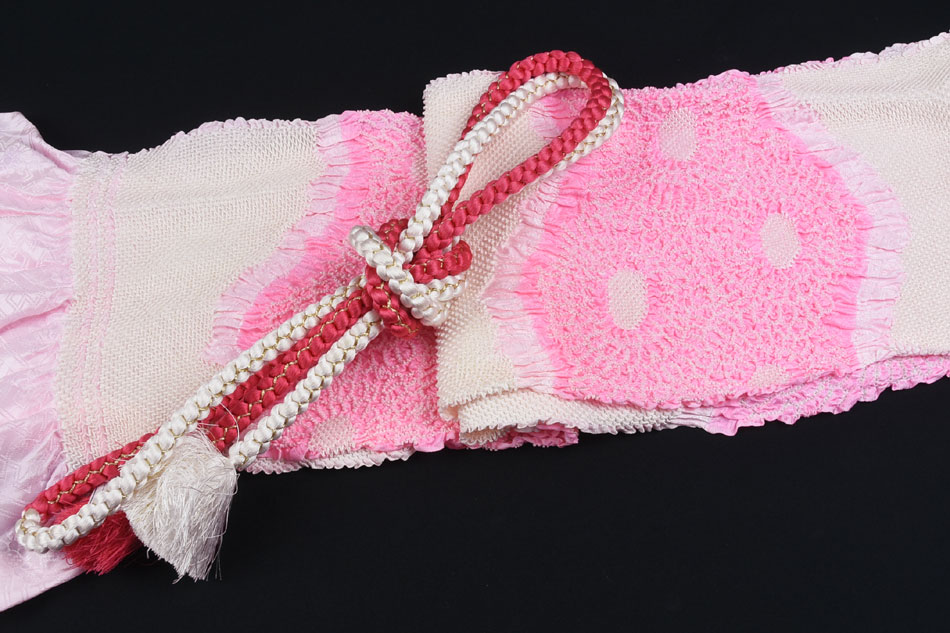 帯揚げは、スベリの良い手触りで光沢のある花サヤガタの地柄を織り込んだ紋綸子の生地をやわらかな薄ピンクに地染めし、曲線重ねに花の柄を生成りの総鹿の子絞りに紅梅色濃淡の桶絞りを加えお洒落に重ね染めした品。