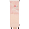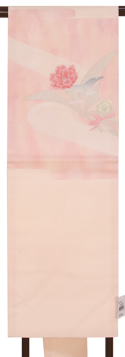 張りのある手触りで確りと打ち込まれた朱鷺(とき)色の絽織り地織りに、お太鼓の流水取り紅梅色濃淡の色箔糸の上に、花の柄を白や赤みのピンク色・青ネズ・銀糸などで重ね織りした品。