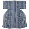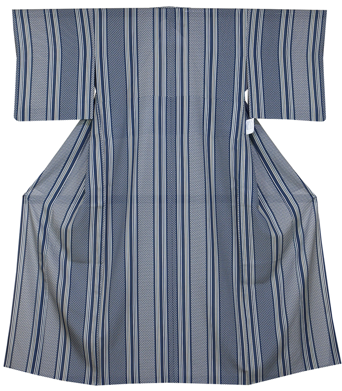 シャリ感のある手触りの絽織りの生地をハナダ色に地染めし、縦線取り縦縞やアラレの柄を白や納戸色、くすんだ黄緑などで重ね染めした品。背伏せは別生地が付き、正絹白絽の衿裏が付いた手縫いの単衣仕立て。衿裏にはくるみホックが付いています。