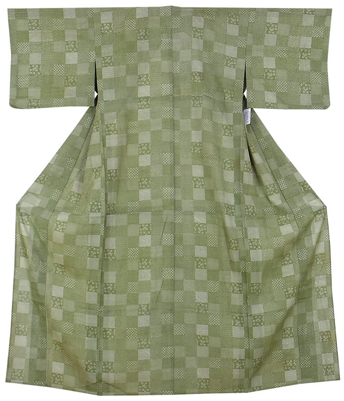 シャリ感のある手触りの絽織りの生地をくすんだ黄緑に地染めし、市松取り寄せ江戸小紋の柄を白ネズで重ね染めした、重要無形文化財保持者(人間国宝)・中村勇二郎氏作の品。背伏せは共生地返しで、正絹白絽の衿裏が付いた手縫いの単衣仕立て。反末証紙に作家名が入っています。