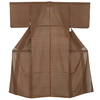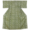 スベリの良い手触りで光沢のある小さな地柄を織り込んだ紋意匠の生地を千歳緑に地染めし、緑みの香色のロウ吹雪を重ね染めした品。腰から下の背縫い沿いに共生地の居敷当てが付き、ポリエステル白の衿裏が付いた手縫いの単衣仕立て。衿裏にはくるみホックが付いています。