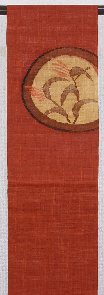 シャリ感のある手触りの縦糸にフシ糸を織り込んだ丹色夏紬地織りに、お太鼓の丸取りススキの柄を砥粉(とのこ)色や黒、赤茶などで重ね織りした品。