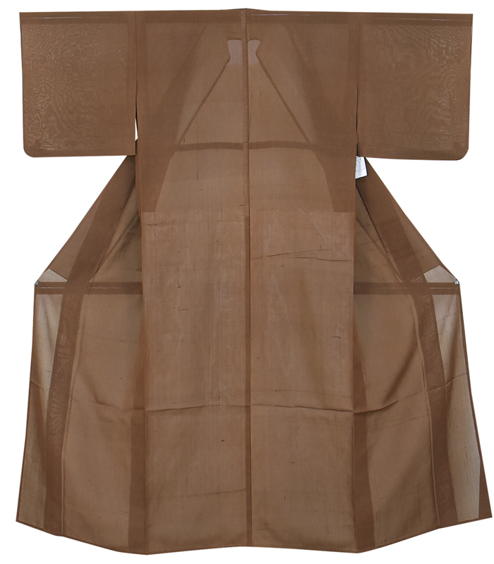 シャリ感のある手触りで縦横にフシ糸を織り込んだ良質な夏紬の生地を赤茶無地で染め上げた品。腰から下の後幅一杯に正絹居敷当てが付き、正絹白の衿裏が付いた手縫いの単衣仕立て。
